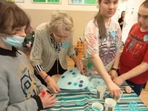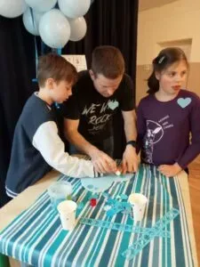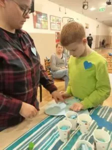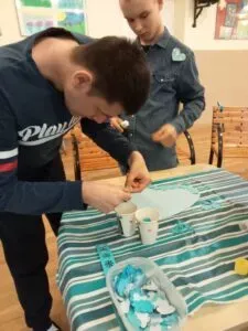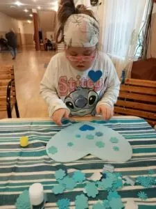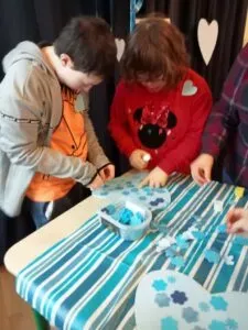 W ramach solidarności z osobami dotkniętymi autyzmem wykonywane były ozdoby i dekoracje w kolorze niebieskim oraz zakładane były elementy ubioru lub kotyliony w tym kolorze. W ramach tej akcji uczniowie naszej społeczności szkolnej wykonywali serca, które ozdabiano niebieskimi elementami dekoracyjnymi. Wykonane prace plastyczne zostały przekazane uczniom z innych klas.