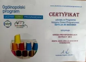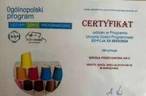 Za zaangażowanie w realizację zadań cyfrowych Szkoła Podstawowa nr 5 i Szkoła Przyspasabiająca do Pracy nr 6 otrzymały certyfikaty. Nagrodzeni certyfikatami przygotowanymi przez organizatora programu zostali także wszyscy uczniowie uczestniczący w Ogólnopolskim Programie „Uczymy Dzieci Programować”.