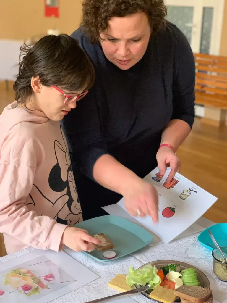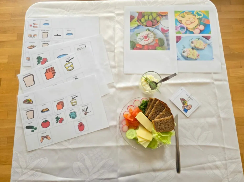 Uczniowie zostali zapoznani z produktami żywnościowymi odpowiednimi do przyrządzenia pełnowartościowego, zdrowego oraz zbilansowanego śniadania. Następnie, w małych grupach, przyrządzali kanapki (według wzoru, przepisu lub według własnej inwencji) z wykorzystaniem chleba pełnoziarnistego/ kukurydzianego/ bezglutenowego, masła, twarożku, żółtego sera oraz miksu warzyw.